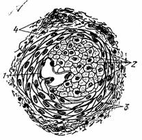 1 — эндотелий; 2 — продольно расположенные эпителиоидно-мышечные клетки; 3 — циркулярно расположенные мышечные клетки средней оболочки; 4 — наружная оболочка.