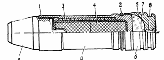 а—осколочная граната; б—пороховой заряд; в — взрыватель' 1—корпус; 2 — ведущий поясок: 3—пружина (осколочная “рубашка”); 4 — разрывной заряд; 5 — гильза; 6 — капсюль воспламенитель; 7 — нитроглицериновый порох