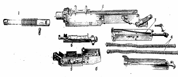 4—возвратные пружины; 5 — приемник; 6 — ударно-спусковой механизм; 7—крышка ствольной коробки с механизмом перезаряжания.