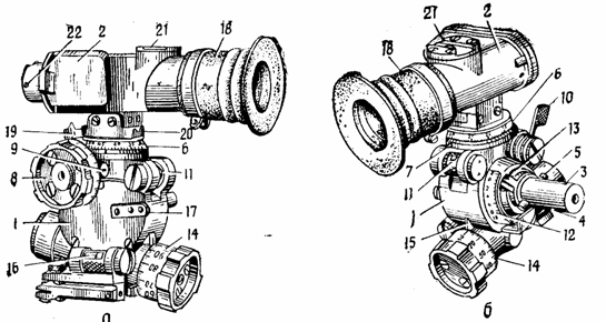 л — вид слева; б—вид справа: 1`—корпус; 2 — головка прицела: 3 — ось прицела; 4 — овальная выемка; S — штифт; 6 — угломерное кольцо; 7—указатель больших делений угломера: 8 — барабанчик угломера; »—указатель делений барабанчика угломера; 10—отводка: //—поперечный уровень; 12— шкала больших делений прицела: 13—указатель шкалы больших делений прицела; 14 — барабанчик прицела; /5 — указатель делений барабанчика прицела; 16 — продольный уровень; 17 — планка для крепления патрона подсветки; /в—наглазник; 19 — мушка; 20 — целик: