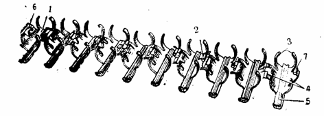 1 — звено ленты; 2 — шплинт; 3 — передние захваты: 4 — эадние захваты; 5 — хвостовик: 6 — соединительное кольцо;