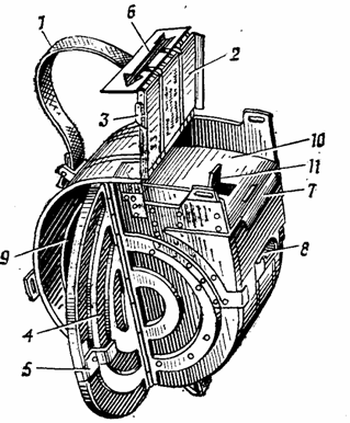 Коробка для выстрелов (рис. 6) служит для помещения ленты с 29 выстрелами. Она имеет ручку для переноски коробки; крышку и створку, закрываемые защелками; шторку для закрывания горловины коробки при транспортировке; обойму с зацепом и зубом для присоединения коробки к гранатомету; внутри—спиральную направляющую (улитку) для