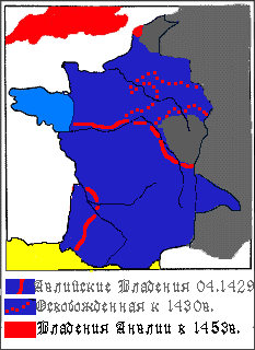 Дофин еще при жизни Генриха V одержал победу при Боже (1421), но затем терпит поражение за поражением: Мон-ан-Вимё (1421), Краван (1423), Вернейль (1424). К 1425 г. англичане постепенно захватывают Мэн, но в связи с усилением в захваченных провинциях партизанского движения, которое сковывает довольно значительные силы, темпы продвижения замедляются. Чтобы полностью подчинить Францию, англичанам достаточно было перейти Луару, занять западные провинции и соединиться с той частью их сил, которая находилась в Гиэни. Именно в этом состоял стратегический план Бедфорда, к осуществлению которого он приступил осенью 1428 г. 12 октября четырехтысячное английское войско осадило Орлеан. Английское командование придавало исключительно важное значение взятию этого большого хорошо укрепленного города. Расположенный на правом берегу Луары, в центре ее плавной и обращенной в сторону Парижа излучины, Орлеан занимал ключевую стратегическую позицию, контролируя дороги, которые связывали Северную Францию с Пуату и Гиэнью. В случае его захвата англичане получали возможность перейти в развернутое наступление, так как к югу от Орлеана у французов не было крепостей, способных остановить натиск противника (см. схему).