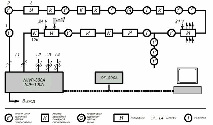 К кольцевому шлейфу подключаются до 32 адресуемых устройств. На нем могут находиться интерфейсные устройства для подключения исполнительных устройств, шифраторов, интерфейсов. Они обеспечены источниками автономного питания.