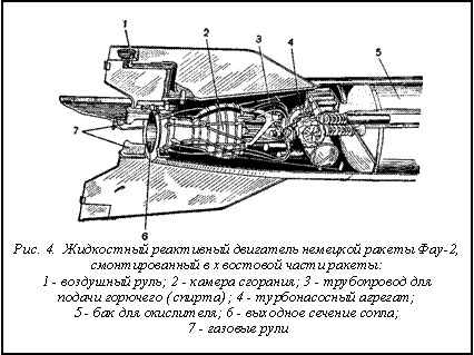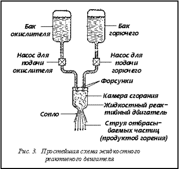 Простейший реактивный двигатель на жидком топливе (рис. 3) представляет собой камеру, похожую по форме на горшок, в котором жители сельских местностей хранят молоко. Через форсунки, расположенные на днище этого горшка, происходит подача жидкого горючего и окислителя в камеру горения. Подача компонентов топлива рассчитывается таким образом, чтобы обеспечить полное сгорание. В камере сгорания (рис. 3) происходит воспламенение топлива, и продукты горения — горячие газы — с большой скоростью выбрасываются через специально профилированное сопло. Окислитель и горючее помещаются в специальных баках, располагающихся на ракете или самолете. Для подачи окислителя и горючего в камеру сгорания применяют турбонасосы или выдавливают их сжатым нейтральным газом (например, азотом). На рис. 4 приведена фотография реактивного двигателя немецкой ракеты Фау-2.