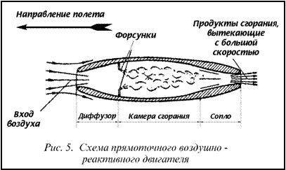 В некоторых случаях для сжигания горючего в камере реактивного двигателя приходится забирать воздух из атмосферы. Тогда в процессе движения реактивного аппарата происходит присоединение частиц воздуха и выбрасывание нагретых газов. Мы получаем так называемый воздушно ─ реактивный двигатель. Простейшим примером воздушно ─ реактивного двигателя будет обыкновенная трубка, открытая с обоих концов, внутри которой помещен вентилятор. Если заставить вентилятор работать, то он будет засасывать воздух с одного конца трубки и выбрасывать его через другой конец. Если в трубку, в пространство за вентилятором, впрыснуть бензин и поджечь его, то скорость выходящих из трубки горячих газов будет значительно больше, чем входящих, и трубка получит тягу в сторону, противоположную струе выбрасываемых из нее газов. Делая поперечное сечение трубки (радиус трубки) переменным, можно соответствующим подбором этих сечений по длине трубки достигнуть весьма больших скоростей истечения