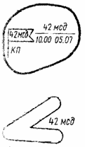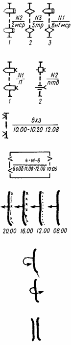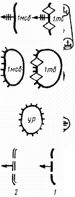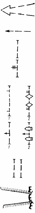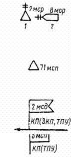 Командно-наблюдательный пункт роты: 1 - в обороне и в пешем порядке в наступлении; 2 - в движении на БМП (на другой технике - с соответствующим знаком). Командно-наблюдательный пункт взвода - с одной черточкой.