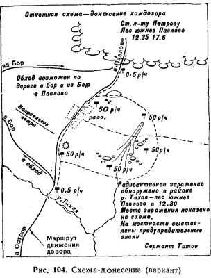 На рисунке приведен возможный вариант отчетной карточки разведки брода. Если на схему (карточку) требуется нанести большой участок местности, например при составлении отчетной схемы—донесения о разведанном (выявленном, установленном) районе радиоактивного заражения местности, то в этом случае местные предметы и границы зараженного участка наносят на схему приемами глазомерной съемки путем обхода участка по ходовым линиям. На такой схеме показывают границы зараженного участка и степень (уровень) радиации, направление ветра, возможные пути обхода зараженного участка, время обнаружения и места расстановки предупредительных знаков. Топографические элементы местности на отчетной схеме показываются более подробно, чтобы облегчить ориентирование подразделений при прохождении участков заражения и привязку схемы к карте.
