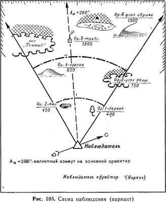 В случае необходимости сведения, полученные наблюдением, передаются по телефону или другим средствам связи. При этом местоположение обнаруженных объектов указывается относительно обозначенных на схеме ориентиров.