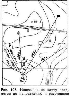отложив на этих направлениях расстояния до предметов, получают их местоположение на карте.