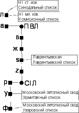 Происхождение источников, использованных в работе показано на рисунке. Квадратами обозначены протографы, кругами — сохранившееся летописи.