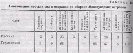 В состав немецкого десанта входило около 25 тыс. человек. Для его поддержки с воздуха было выделено до 100 самолетов и дирижаблей. Таким образом, немцы превосходили русских в этой операции в сухопутных силах в два раза, в морских (табл. 10) и воздушных силах примерно в три раза.