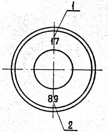 Рис. 13. Образец маркировки на торце донной части гильзы: 1-условный номер предприятия-изготовителя; 2-год изготовления (две последние цифры года) |