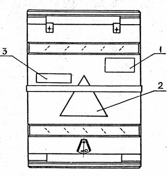 Рис. 14. Образец маркировки на крышке деревянного ящика: 1-брутто: 2-знак разряда груза или условный номер опасного груза СССР 3-ярлык со знаком опасности груза или классификационный шифр |