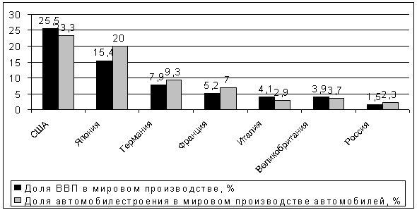 В экспорте промышленно развитых стран доля готовых легковых автомобилей по стоимости составляет 7-8% от общего объема и 13-15% экспорта машин и оборудования. Автомобильная промышленность явилась одним из рычагов подъема всего материального производства в послевоенных Японии и Германии. Оно играет прогрессивную роль в общенациональном подъеме производства и сферы услуг в Испании, Южной Корее, Мексике и Бразилии, Польше и Чехии. Многие страны в том числе США, ведущие страны Западной Европы, а также Австралия и Новая Зеландия практически достигли своего предела по насыщенности легковыми автомобилями (США 740 автомобилей на 1000 жителей). В России же достижение через 5 лет уровня автомобилизации 150 автомобилей на 1000 жителей можно считать важнейшей социально- экономической задачей. [6]