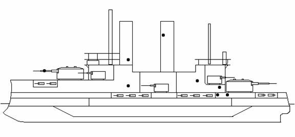 каземата 75-мм артиллерии с прорезанными портами. В носовой части второй броневой пояс возвышался над водой примерно на 2 м вместо 2.8 м по проекту, что в условиях 3-4 бального волнения в бою 14 мая приводило к захлестыванию незащищен-ного легкого борта. Впрочем, на японских броненосцах 102 мм пояс в носовой оконечности защищал надводную часть на высоту около 1 м.