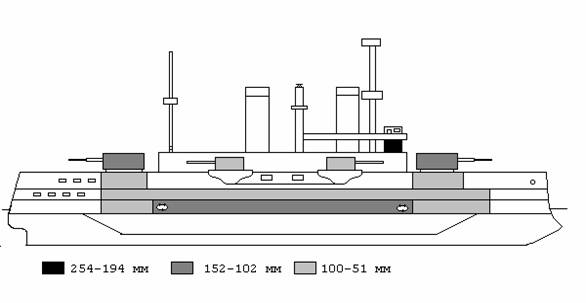 На броневую защиту этих кораблей приходилось от 2800 до 2900 т (указываются разные цифры, что, по-видимому, связано с различной толщиной брони главного пояса на головном и последующих кораблях),или около 26% нормального водоизмеще-ния. Это был средний показатель. Например, у английских броненосцев (и японских, строившихся в Англии) на броню приходилось от 30 до 33.5%.