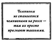 Есть такое старое высказывание: «Чемпионы не становятся чемпионами на ринге — там их просто признают таковыми». Это верно. Если вы хотите увидеть, как кто-то превращается в чемпиона, посмотрите на его будничный распорядок дня. Бывший чемпион мира в тяжелом весе Джо Фрейзер заявил: «Вы могли наметить план боя или план жизни. Но когда все реально начинается, дело может пойти вовсе не так, как вы планировали, и нужно будет полагаться на свои рефлексы. Именно