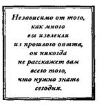Каждый прошлый успех или неудача могут послужить источником информации и мудрости, — если только вы позволите им действительно быть таковыми. Успехи позволяют вам многое узнать о самом себе и о том, чего вы способны добиться с помощью своих конкретных способностей и талантов. Неудачи показывают, какого рода ошибочные предположения вы делали и где ваши методы оказались порочными. Если вы не умеете учиться на собственных ошибках, то обречены на то, чтобы снова и снова терпеть неудачи. Именно поэтому эффективные навигаторы начинают с прошлого опыта. Но они, конечно же, отнюдь не заканчивают им.