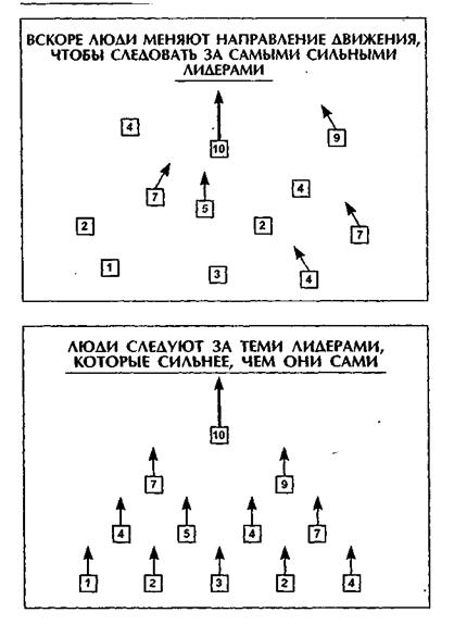Посмотрите, что случается, когда люди впервые собираются вместе как единая группа. По мере того как они начинают взаимодействовать между собой, в группе выявляются лидеры, которые и берут на себя контроль над происходящим. Эти люди мыслят в терминах направления, в котором они желают двигаться, и тех спутников, которых хотят забрать с собой. Поначалу члены такой группы могут делать пробные шаги в нескольких разных направлениях, но после того как все узнают друг друга получше, им не требуется много времени, чтобы распознать самых сильных лидеров и последовать за ними.