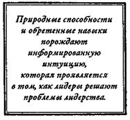 Благодаря своей интуиции лидеры оценивают все через призму лидерства. Некоторые люди рождаются с хорошей лидерской интуицией. Другие должны упорно трудиться, чтобы развивать и оттачивать ее. Но каким бы способом ни возникал конечный результат, он представляет собой сочетание природных способностей и обретенных навыков. Только такого рода информированная интуиция и позволяет решать проблемы лидерства. Лучшим способом описать эту своеобразную предрасположенность является способность лидеров воспринимать неосязаемые факторы, понимать их и работать с ними для достижения своих целей, относящихся к лидерству.