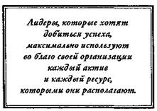 Основное различие между теми, кто добивается персонального успеха, и настоящими лидерами состоит в том, как они воспринимают наличные ресурсы. Преуспевающие индивидуалисты думают в терминах того, что они в состоянии сделать. Успешные лидеры, с другой стороны, видят каждую ситуацию в терминах доступных ресурсов: денег, сырья, технологии и, наконец, самого важного — людей. Они никогда не забывают, что их самый главный актив и достояние — это люди.
