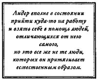 Разумеется, лидер вполне в состоянии прийти куда-то на работу и взять себе в помощь людей, отличающихся от него самого. Хорошие лидеры знают, что один из секретов успеха состоит в таком комплектовании персонала, чтобы он восполнял их собственные слабости. Тем самым лидер сможет сосредоточиться и функционировать в тех областях, где он силен, в то время как другие станут заботиться об иных, столь же важных вопросах, которые иначе могли бы остаться без внимания. Но чрезвычайно важно осознавать, что люди, отличные от вас, не будут тянуться к вам естественным образом. Лидеры притягивают тех, кто подобен им самим.