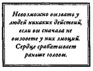 Настоящие лидеры знают, что сначала нужно тронуть сердца людей и лишь после ожидать, что они последуют за вами. Это и есть закон связи. Все великие коммуникаторы признают эту истину и почти инстинктивно действуют в соответствии с нею. Невозможно вызвать у людей никакого действия, если сначала вы не вызовете у них эмоций. Сердце срабатывает раньше головы.