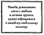 Ключевым в деле установления связей с окружающими является осознание того, что даже в группе вы должны обращаться к каждому отдельному человеку. Генерал Норман Шварцкопф заметил: «Я видел вполне компетентных лидеров, которые стояли перед взводом, и единственное, что они видели, был взвод. Но великие лидеры стоят перед взводом и воспринимают его как 44 отдельные личности, каждая из которых обладает собственными устремлениями, каждая хочет жить и каждая хочет творить добро».