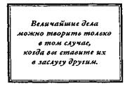 Только уверенные в себе лидеры способны отдавать себя другим. Марк Твен однажды отметил, что великие дела можно творить, лишь когда вас не заботит, кто поставит их себе в заслугу. Но можно пойти на шаг дальше. Я убежден, что величайшие дела можно творить только в том случае, когда вы ставите их в заслугу другим. Это и есть закон наделения полномочиями в действии. Адмирал Джеймс Б. Стокдейл, который был однажды кандидатом в вице-президенты, утверждал: «Лидерство должно быть основано на доброй воле . Оно означает очевидное и чистосердечное обязательство помогать своим приверженцам и последователям . Кто нам нужен, пк это лидеры с открытой душой, которые настолько стремятся помогать людям, что в итоге готовы признать мою работу ненужной. Но в том-то и суть настоящих лидеров, что они никогда не остаются без работы, равно как никогда не остаются без последователей. Как бы странно это ни звучало, но великие лидеры обретают власть, отдавая ее другим».