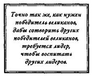 Все мы отождествляем себя с подобным рассказом, потому что любим возгласы одобрения в адрес того, кто поначалу считался обреченным на поражение. Но многие не знают продолжения данной истории. Давид вырос, возмужал и сам превратился в воина, а в конечном счете стал царем Израиля. Но перед этим он воспитал группу великих воителей, которых называли его «отборными мужами». Не менее пяти из них также стали победителями великанов — точно так же, как их лидер. Мог ли достичь этого Саул, предыдущий царь? Нет. Для этого требовался человек, который в свое время сам сумел сделать то, чему потом научил других мужей Израиля. -И точно так же, как нужен победитель великанов, дабы сотворить других победителей великанов, требуется лидер, чтобы воспитать других лидеров.