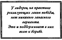 А каков ваш собственный уровень ожиданий, когда речь идет об успехе вашей организации? Насколько вы лично преданы идее победы в вашей «игре»? Готовы ли вы сделать закон победы краеугольным камнем своей битвы за успех или же, когда времена становятся трудными, вы готовы поднять белый флаг? Ваш ответ на этот вопрос может предопределить, потерпите ли вы как лидер неудачу или же преуспеете в этом качестве.