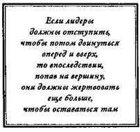 Если лидеры должны отступить, чтобы потом двинуться вперед и вверх, то впоследствии, попав на вершину, они должны жертвовать еще больше, чтобы оставаться там. Вы когда-либо задумывались над тем, насколько редко у спортивных команд случается два или три чемпионских сезона подряд? Причина проста: если лидер в состоянии привести команду к финальной встрече на звание чемпиона и победить в ней, он часто предполагает, что сможет без особых проблем еще раз повторить такие же результаты на следующий год, не проводя для этого никаких изменений. Тренер внутренне сопротивляется необходимости приносить в межсезонье дополнительные жертвы. Но того, что однажды привело команду на вершину, недостаточно, чтобы она продолжала там оставаться. Единственный способ сохранить место на вершине — пожертвовать еще большим, чем в прошлый раз. Успех в деле лидерства требует непрерывных изменений, усовершенствований и жертв. Поэт-философ Ралф Уолдо Эмерсон предлагает следующую альтернативу: «За все упущенное вы обретаете нечто иное; и за все обретенное вы нечто теряете».
