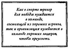 Независимо от того, насколько он хорош, никакой лидер не в состоянии сделать все в одиночку. Как в спорте тренер для победы нуждается в команде, состоящей из хороших игроков, так и организация нуждается в команде хороших лидеров, чтобы преуспеть. Чем крупнее организация, тем более сильной, большой и глубоко укорененной должна быть там команда лидеров.