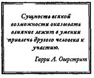 Но в добровольных организациях типа церкви единственная вещь, которая дает эффект, — это лидерство в его чистейшем виде. Лидерам здесь может помочь только одна вещь — их влияние. А как заметил Гарри А. Оверстрит, «сущность всякой возможности оказывать влияние лежит в умении привлеч другого человека к участию». В добровольных организациях нельзя заставить других следовать за собой. Если лидер здесь не располагает никаким влиянием на людей, то они просто не пойдут за ним. Когда я недавно высказал это соображение перед группой слушателей, насчитывавшей около 150 высших руководителей автомобильной промышленности, то увидел, как у них загорелись глаза. А после того как я дал им один совет, они по-настоящему воодушевились. Хочу поделиться тем же самым советом и с вами: если вы занимаетесь бизнесом и действительно хотите выяснить, способны ли ваши сотрудники вести за собой людей, отправьте их поработать некоторое время в любой общественной организации, которая опирается на принцип добровольности. Если они смогут заставить людей следовать за ними, занимаясь деятельностью в Красном Кресте, в организации «Единый путь», дающей пристанище бездомным, или в местном церковном приходе, то это будет означать, что они действительно обладают влиянием — и способностями к лидерству.