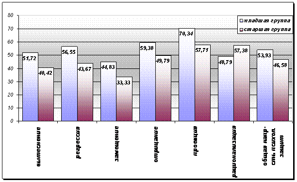 В процессе диагностики и математико-статистической обработки данных у респондентов младшей группы были выявлены следующие выраженные психологические защиты: вытеснение, регрессия, отрицание, проекция. Наиболее деструктивными для психического здоровья являются – вытеснение и проекция.