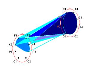 При этом очаг активности, находящийся в передних отделах левого полушария, обусловлен формированием функционального состояния, способствующего успешности деятельности, но не специфического к ее характеру, второй же очаг, находящийся в задних отделах правого полушария, специфичен для ЭСВ. В других исследованиях получены три подобных очага активности: два совпадают с вышеуказанными, а третий находится в центральным отделе правого полушария (рис.2) [26; 27].