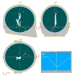 Рис.2. Источники активности в глубинных структурах мозга медленных колебаний в области вертекса. Локализация источников определяется в трех проекциях головы (боковой, передне-задней и верхне-нижней) и соответствует зонам медиального таламуса, эпифиза, ретикулярной формации ствола.