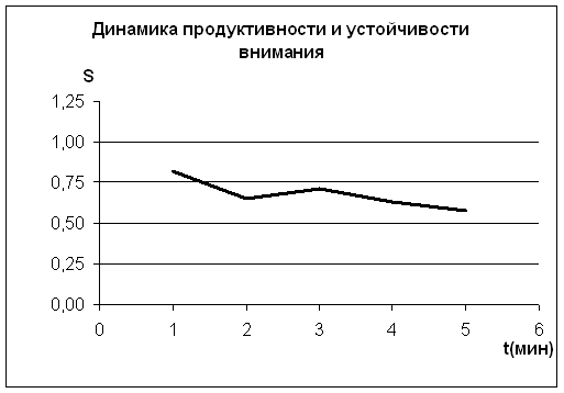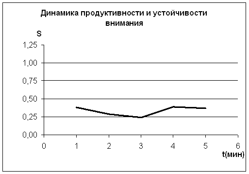 Вывод: Показатель S =0,74 , таким образом, продуктивность внимания средняя – оценивается на 4-5 баллов. На графике видны большие колебания внимания, сам график находится в четырех разных зонах, следовательно внимание неустойчиво и оценивается 4-5 балла.