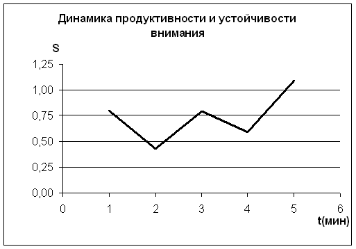 Вывод: График находится в зоне низкопродуктивного внимания (2-3 балла), но все точки графика находятся в одной зоне, колебания незначительные, внимание очень устойчиво, оценивается на 10 баллов.