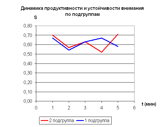 Таким образом, мы видим, что действительно существуют индивидуальные различия во внимании. При там, что все участники эксперимента примерно одного возраста? Состояние здоровья хорошее, условия проведения эксперимента одни и те же. Если сравнивать 2 подгруппы и построить график на подгруппу в целом путем сложения всех показателей S1, S2, S3, S4, S5 подгруппы и разделить числа на 5( по количеству участников) получим: