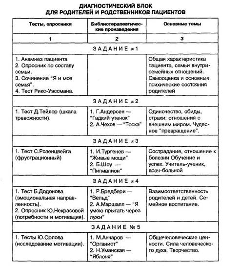 3) сформировать установку на сотрудничество и осознание своей роли в предстоящем лечении близкого человека, снять возможные сопротивления предстоящей работе. С этой целью родители и родственники пациентов были включены в динамическую психотерапевтическую диагностику, апробированную и прошедшую многолетнюю проверку в системе данной методики. Диагностический блок для родителей и родственников выстроен на основе и с соблюдением основных принципов комплексного диагностического блока для пациентов. Он содержит в себе как традиционные психологические методы исследования (стандартизованные тесты С.Розенцвейга, Рикс-Уэссмана, Д.Тейлор (шкала тревожности) и др.), так и специально разработанные или специфичные только для данного контингента (опросники по семье, управляемое сочинение "Я и моя семья", "Мотивация и потребность"). Особое место в данной диагностике занимает письменный анализ предложенной библиотерапевтической литературы.