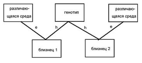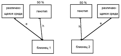 В этом методе проводится внутрипарное сравнение близнецов, разлученных в раннем возрасте. Если МЗ близнецы были разлучены подобным образом и росли в разных условиях, то все их сходство должно быть определено их генной идентичностью, а различия – влиянием средовых факторов (см. рисунок).