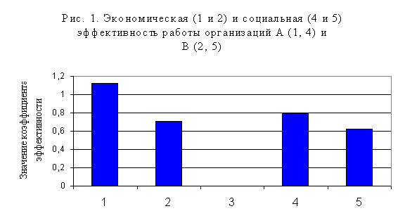 Результаты расчетов коэффициентов экономической и социальной эффективности работы исследованных организаций представлены на рис.1. Видно, что экономическая эффективность в глазах сотрудников организации А существенно выше, чем экономическая эффективность организации В.