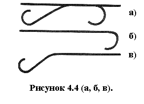 5. «Хорошая линия». Этот фактор определяет восприятие пересечений двух или более контуров (рис. 4.4). Зрительная система в соответствии с действием этого фактора старается сохранить характер кривой до пересечения и после него. Так, например, на рис. а) наблюдатель чаще всего видит прямую и гнутую линию, хотя, в принципе, рисунок мог бы состоять из элементов показанных на рис. б), рис. в). Действие этого фактора тем сильнее, чем регулярнее кривая.