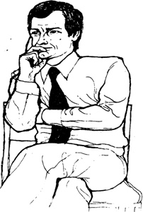 Рис.3 показывает совокупность жестов, обозначающих критически оценочное отношение, главным здесь является жест "подпирание щеки указательным пальцем", в то время как другой палец прикрывает рот, а большой палец лежит под подбородком. Следующим подтверждением того, что слушающий относится к вам критически, является то, что ноги его крепко скрещены, а вторая рука лежит поперек тела, как бы защищая его, а голова и подбородок наклонены (враждебно). Это невербальное предложение говорит вам приблизительно следующее: "Мне не нравится, что вы говорите, и я с вами не согласен".