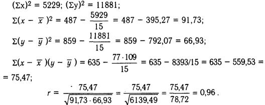 Число степеней свободы fd = п - 2 = 15 - 2 = 13. По таблице уровней значимости находим, что при 13 степенях свободы r0,999 = = 0,760. Сравниваем это значение с полученным коэффициентом: