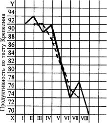 Основная тенденция изменения умственной работоспособности вполне ясна. Наблюдаемые, в общем, незначительные отклонения от этой тенденции могут быть на графике устранены методом сглаживания. В этом случае применим метод скользящей средней. Для сглаживания суммируются три показателя у — в данном примере это показатели продуктивности по тесту, — далее, опуская по одному показателю, суммируются одна за другой триады. Средняя каждой триады принимается за показатель сглаженной ломанной, если ориентироваться по графику. Смысл проводимого действия состоит в том, что основная тенденция выступает более отчетливо.