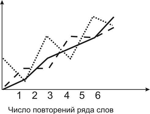 Число повторных предъявлений ряда и последующих попыток его воспроизведения в данной методике ограничено шестью. С каждой попыткой воспроизведения соотносится число правильно воспроизведенных слов, а полученные в итоге данные представляются в виде графика заучивания (рис. 5).