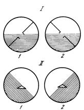 1 — вид индикации "с земли на самолет": 1 — левый крен. 2 — правый крен; II — вид индикации "с самолета на землю": 1 — левый крен, 2 — правый крен